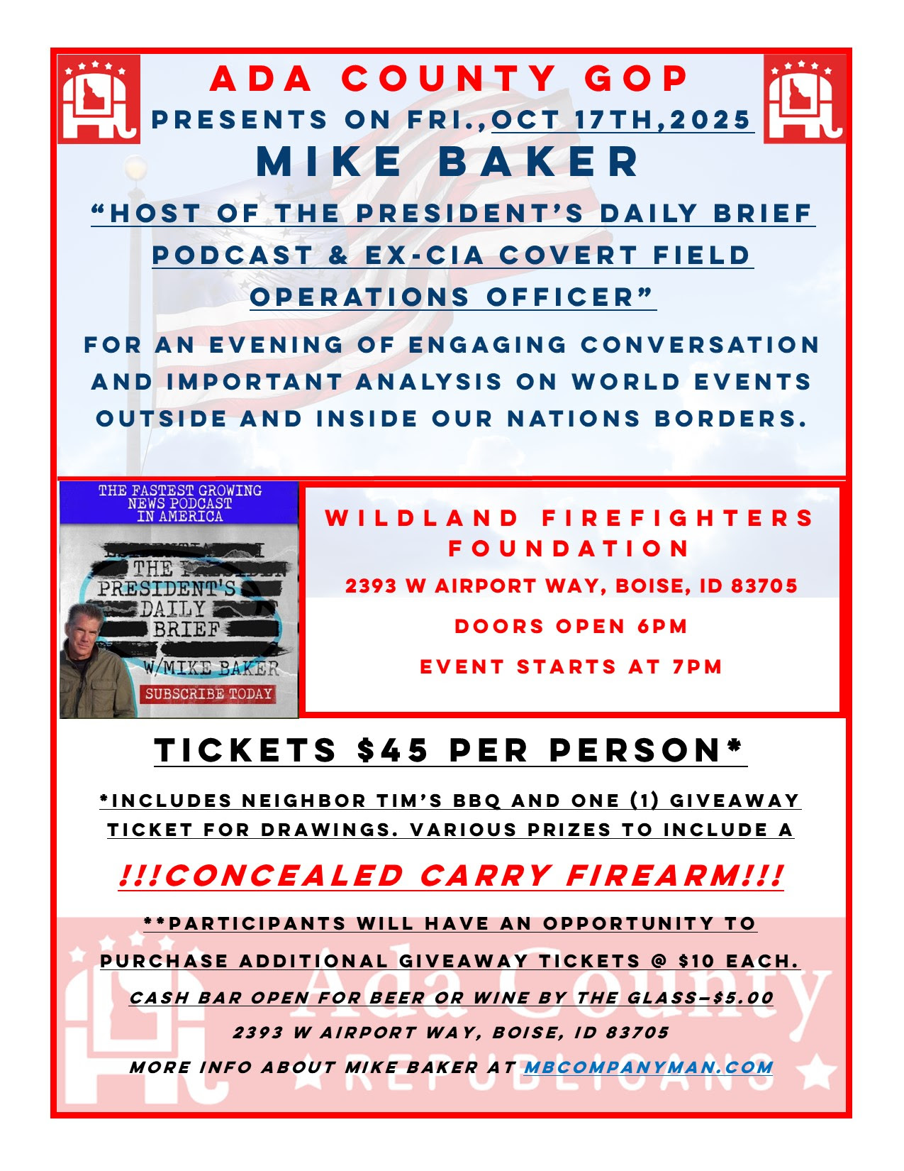 • Oct. 17, 2025, Doors open at 6pm — Mike Baker Event (Buy Tickets)